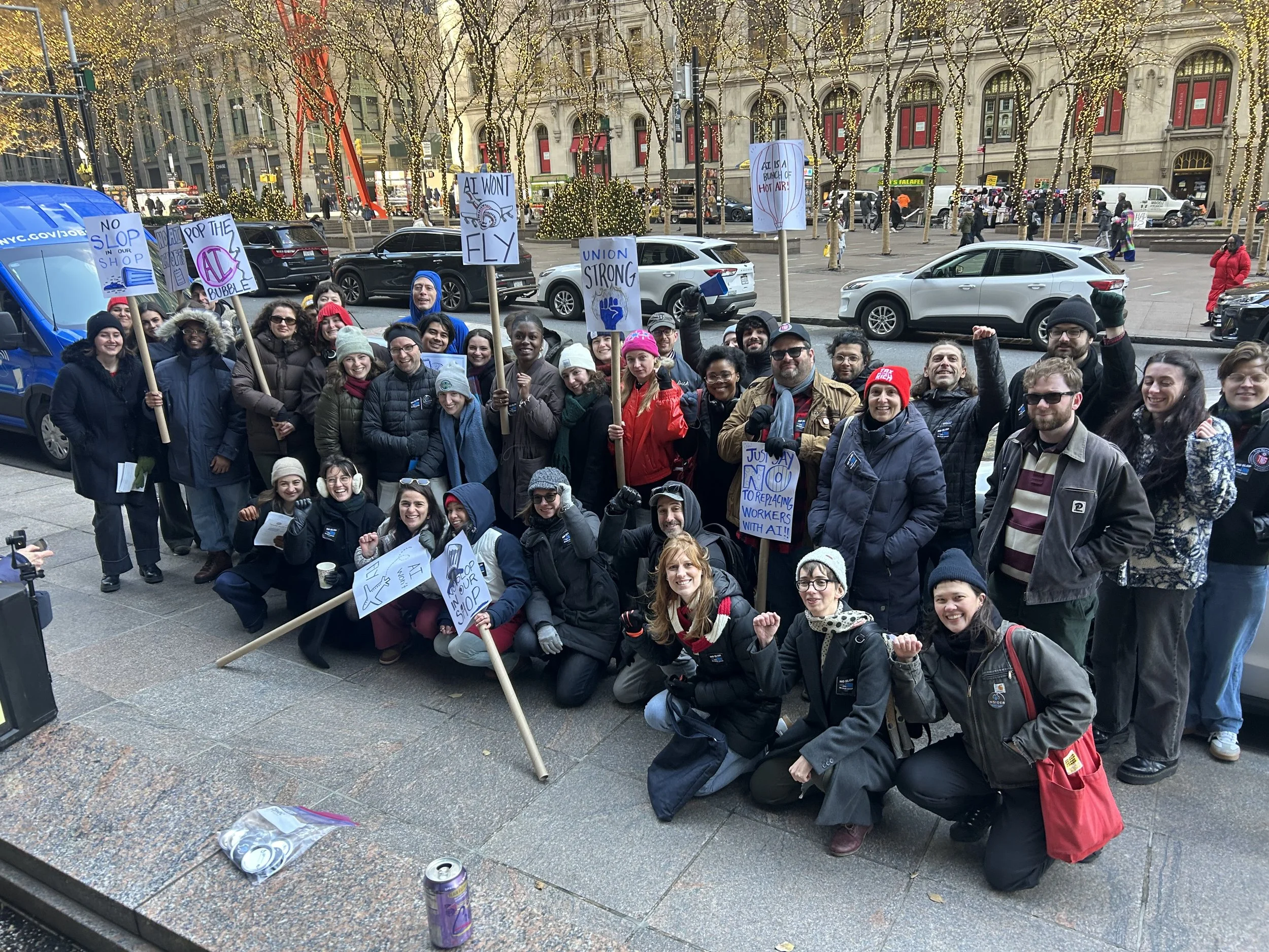 NewsGuild of New York-represented journalists at Business Insider rallied outside company headquarters at One Liberty Plaza in NYC on Dec. 3 to protest management’s planned roll-out of AI-generated news stories.